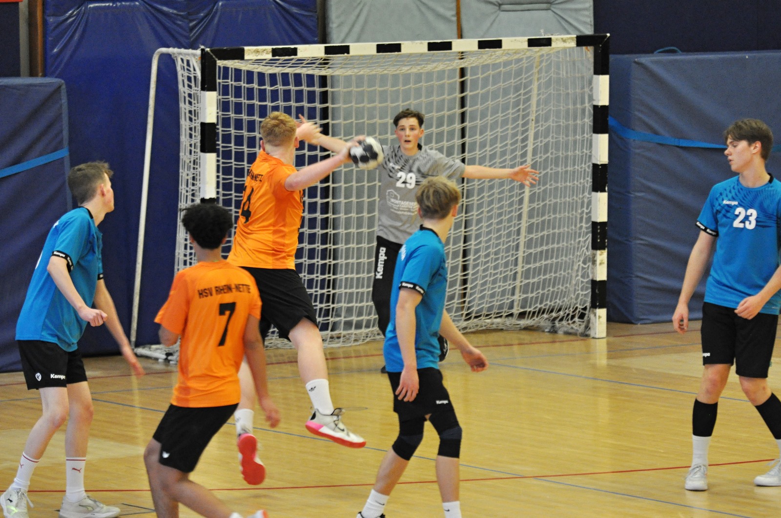 Das Rückspiel nach fast einem Monat Pause startete mit leichten Ballverlusten in der Offensive und so konnte die HSG zunächst 2 und schließlich auch 3 Tore Vorsprung aufbauen. Der Einsatzwille der Kombinierten war da, einige gute Abschlussmöglichkeiten wurden aber nicht genutzt und auch hastigere Versuche ließen den Torwart der Gäste langsam warm laufen. In einem nie unfairen aber manchmal ungestümen Spiel sah sich Schiedsrichter Steuernagel öfter zur Moderation gezwungen, weil auch die HSG willens war der Favoritenstellung gerecht zu werden. Durch Tore von Malte Hintz, Amin Gharbaoui und Romeo Kohlhaas gelang es der HSV auch ständig wieder auf einen Treffer zu verkürzen - lediglich der Ausgleich oder gar die Führung gelang dabei nie und statt kurz vor der Pause noch einmal in Schlagweite zu kommen, stand die 17:12 Führung für das Team von Trainer Olaf Gierenz auf der Anzeigetafel. Mit Simon Catalin für Jannik Höblich im Tor sollte in der zweiten Halbzeit ein neuer Anlauf unternommen werden und tatsächlich konnten Amin, Tjark Heiden und Max Koch einen 7:2-Lauf verbuchen.